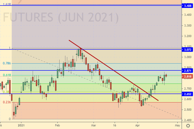 Сценарий роста: рассматриваем майский фьючерс, дата экспирации 14 мая. «Вдруг мы на 800.0 пошли», — предполагали мы на прошлой неделе. 800.0, наверное, это слишком амбициозно, а вот до 750.0, вполне можем добраться. Холодная погода в США нервирует быков. Держим лонги.