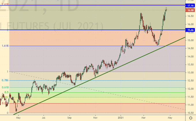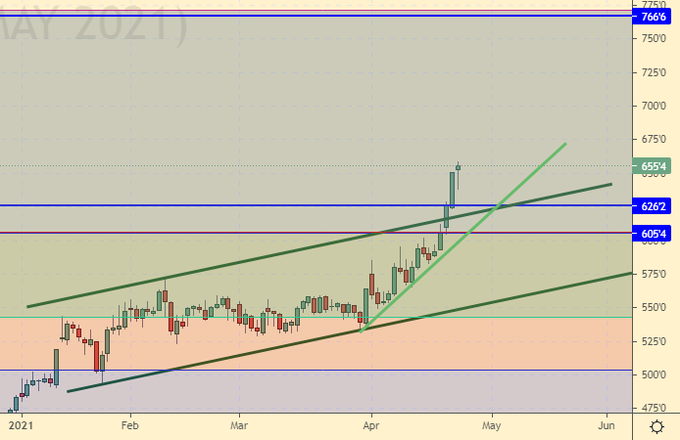 Видим, что быки полностью контролируют рынок зерновых. Идет разгон цен перед майским заседанием USDA. Скорее всего, после бурного роста рынок в мае откатит вниз. А вот глубина отката будет зависеть от погодных условий. Напомним, что, судя по тому, что спрос практически догнал по объему валовый сбор, рынок от крайне высоких цен спасет только рекордный урожай зерновых. А он уже под вопросом, по крайней мере в США, во многих штатах банально холодно и сухо.