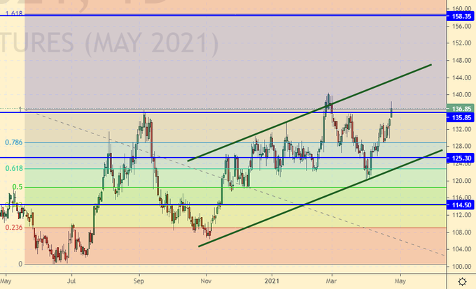 Сценарий роста: рассматриваем майский фьючерс, дата экспирации 18 мая. Мы взяли и выросли выше 135.0. Если вы еще не вошли в лонг, сделайте это и добавьте в случае отката к 130.0.
