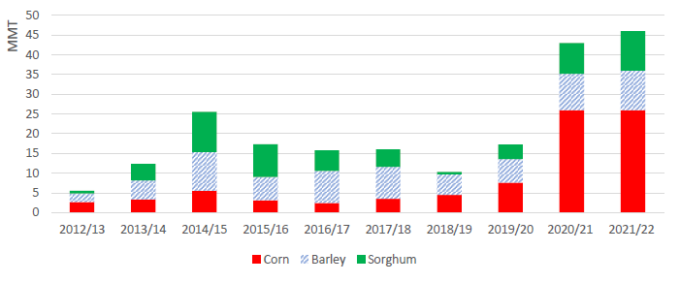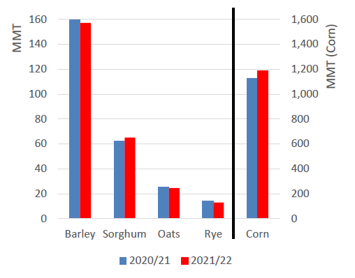 Объем импорта кукурузы в Европейский союз вырастет на 4,0 млн. тонн до 16,0 млн. за счет восстановления предложения в Украине, основном поставщике кукурузы. Объем импорта кукурузы в Соединенное Королевство снизится на 500 000 тонн до 2,2 млн. Ожидается, что как ЕС, так и Соединенное Королевство сократят кормовое потребление ячменя в 2021/22 году в пользу пшеницы; кукуруза также будет играть большую роль в кормовом потреблении в ЕС.