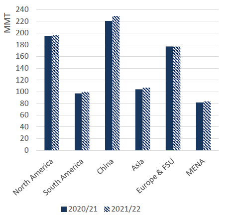 Прогнозируется, что импорт фуражного зерна в Китай вырастет по сравнению с пересмотренной оценкой 2020/21 года в связи с ожиданиями высокого спроса на корма в свиноводстве. Внутренние цены на кукурузу остаются на рекордном уровне, несмотря на существенное высвобождение многолетних запасов пшеницы и риса из резервов. Кроме того, с целью сократить потребление кукурузы и снизить цены, Министерство сельского хозяйства Китая выпустило в апреле новое руководство, предлагающее более низкие уровни использования кукурузы в кормах для свиней и птицы и рекомендующее сорго и ячмень в качестве заменителей кукурузы среди других кормовых ингредиентов. Импорт кукурузы прогнозируется на уровне 2020/21 года, в то время как импорт ячменя и сорго будет расти при большей доступности на мировом рынке. Учитывая, что совокупный импорт фуражного зерна приближается к 50 миллионам тонн, ожидается, что спрос Китая будет определять динамику мировой торговли в 2021/22 году.