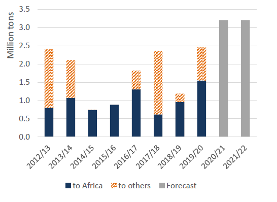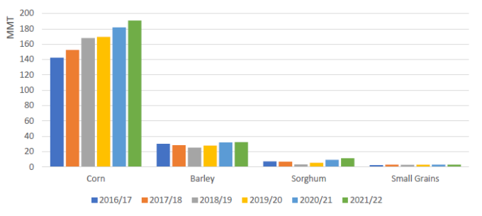 Ожидается, что в 2021/22 году экспорт кукурузы из Южной Африки составит 3,2 миллиона тонн, в соответствии с уровнем 2020/21 года. В стране ожидается очередной обильный урожай и умеренный рост кормового потребления, что приведет к увеличению запасов и активному экспорту. Страна является постоянным поставщиком белой кукурузы в соседние страны, и в прошлом экспорт достигал рынков Азии и Латинской Америки, когда экспортные запасы были в изобилии. При прогнозируемом высоком производстве в соседних странах кукуруза Южной Африки может выйти на рынки за пределами Африки.