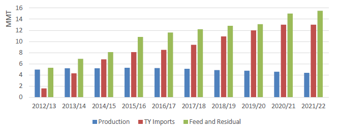 Рисунок 5. Производство и кормовое потребление кукурузы во Вьетнаме (май-апрель); Импорт (октябрь-сентябрь)
