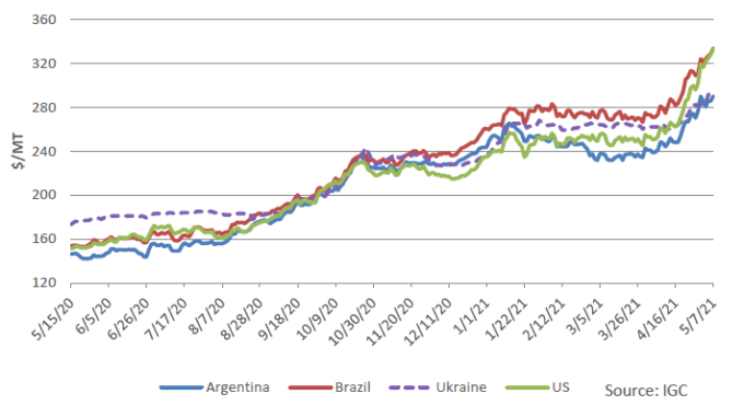 С момента публикации апрельского отчета WASDE все основные экспортные цены резко выросли, что отражает озабоченность по поводу засушливой погоды и ее потенциального воздействия на производство в Бразилии. Цены в Бразилии выросли на 63 доллара за тонну до 334 долларов, а предложения Аргентины поднялись на 51 доллар за тонну до 290 долларов. Цены в Украине выросли на 33 доллара за тонну до 295 долларов. В США подорожание составило 82 доллара за тонну до 333 долларов, чему способствовали растущие опасения в отношении Бразилии и высокий зарубежный спрос. Цены в США находятся на самом высоком уровне со времен засухи 2012/13 года.
