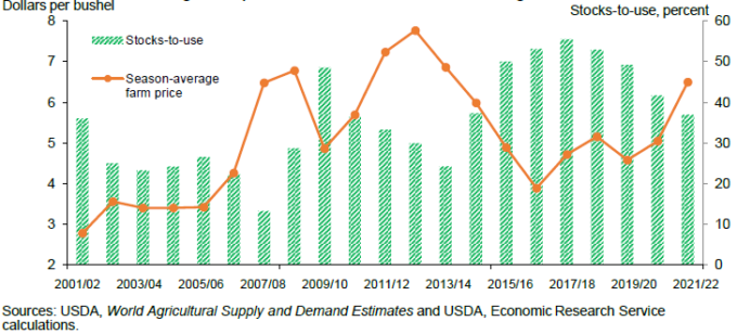 В этом месяце Национальная служба сельскохозяйственной статистики Министерства сельского хозяйства США (NASS) опубликовала первый основанный на опросе прогноз производства озимой пшеницы на 2021/22 маркетинговый год, указывающий на 10-процентный рост год к году. Несмотря на ожидания увеличения совокупного производства пшеницы, более низкие начальные запасы приводят к сокращению предложения в США. Согласно прогнозу, конечные остатки 2021/22 маркетингового года упадут на 11 процентов при соотношении остатков к потреблению на уровне 37 процентов. Из-за значительно более ограниченного баланса и роста цен на кукурузу, среднесезонная цена на пшеницу в США, по прогнозам, достигнет 6,50 долларов за бушель, что является самым высоким показателем за 8 лет (рисунок 1).
