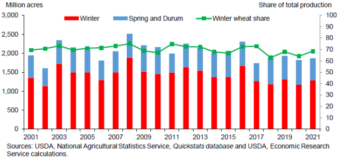 Рисунок 2. Прогноз для озимой пшеницы предполагает рост ее доли в общем производстве пшеницы в США в 2021 году.