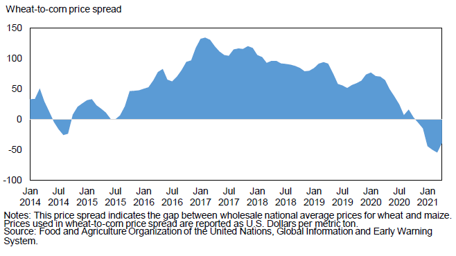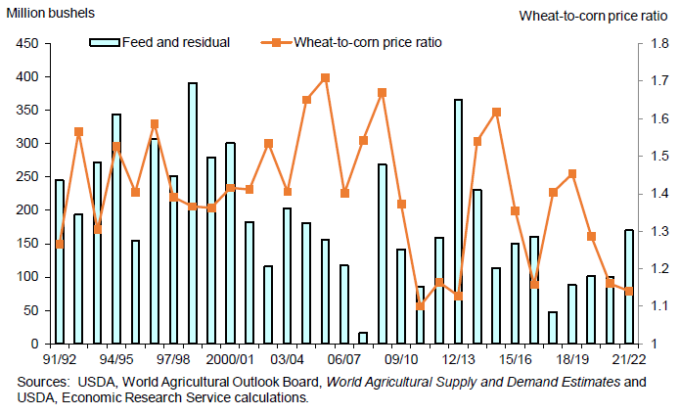 Прогнозы указывают на ожидания увеличения производства фуражного зерна в 2021/22 году, в основном за счет увеличения производства кукурузы. Пшеница также используется в кормлении животных, и ожидается, что она принесет больше урожая. Несмотря на рост производства, согласно прогнозу, в следующем маркетинговом году коэффициенты использования запасов кукурузы и пшеницы снизятся, что будет способствовать повышению цен. Поскольку цены на кукурузу растут пропорционально больше, чем на пшеницу, понижательное давление оказывается на соотношение цен на пшеницу и кукурузу, что повышает предпочтительность добавления пшеницы в кормовые рационы (рис. 3). Увеличение производства пшеницы повышает остаточную часть кормового и остаточного потребления пшеницы, что в сочетании с ожидаемым увеличением кормового потребления пшеницы в первом квартале поддерживает увеличение на 70 миллионов бушелей (или почти 60 процентов) до 170 миллионов в 2021/22 году.