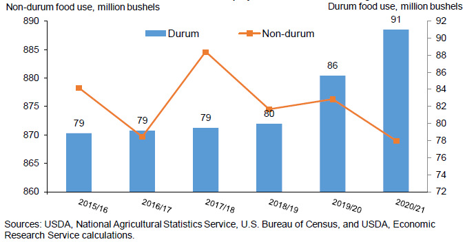 В отличие от совокупного продовольственного потребления, продовольственное потребление дурума в текущем маркетинговом году по-прежнему превышает прошлогодний уровень и значительно превосходит средние расчетные показатели. Продовольственное потребление дурума в 2020/21 году оценивается в 91 миллион бушелей, что является рекордным показателем (рисунок 4). Повышенное потребление муки из дурума и семолины отражает рост потребления макаронных изделий — доступного продукта, который вновь стал популярным во время пандемии COVID-19. Продовольственное потребление дурума в течение первых 10 месяцев маркетингового года на 6,3 миллиона бушелей превышает объем предыдущего года. Почти 5 миллионов бушелей этого увеличения (или почти 80 процентов) приходится на рост импорта продукции из твердых сортов пшеницы, в основном пасты. США импортируют продукты из твердой пшеницы в основном из Италии и Канады.