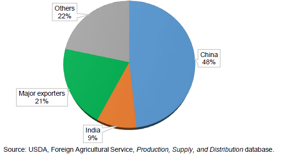 Прогнозируется, что мировые остатки вырастут до 295 млн. метрических тонн, но останутся немного ниже рекордного уровня конечных остатков 2019/2020 года. Остатки Китая снизятся второй год подряд примерно на 3,0 млн. метрических тонн по сравнению с предыдущим годом до 142,4 млн. тонн. Согласно прогнозу, на долю Китая по-прежнему будет приходиться 48 процентов мировых остатков (рисунок 6). Прогнозируется, что вторые по величине остатки Индии, вырастут на 825 000 тонн до 28 миллионов при очередном рекордном урожае.