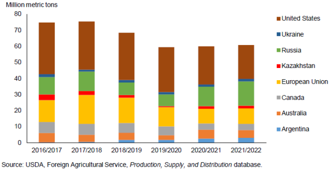 Прогнозируется, что в 2021/22 году мировой объем торговли вырастет на 6,1 миллиона метрических тонн до рекордных 203,2 миллиона тонн в течение торгового года с июля по июнь. Ожидается, что Россия вновь станет крупнейшим мировым экспортером пшеницы с объемом поставок 40 миллионов тонн, что на 500 000 больше, чем в предыдущем году. Урожай в России лишь немного меньше рекордного уровня прошлого года. Общие запасы вырастут еще больше в связи с более высокими начальными запасами. Следующий по величине поставщик, Европейский Союз, по прогнозам, увеличит экспорт на 3 миллиона тонн до 33 миллионов при значительном росте урожая. Соединенные Штаты станут третьим по величине экспортером пшеницы, при этом объем поставок снизится на 1,5 миллиона тонн до 25 миллионов. Согласно прогнозу, Канада экспортирует 23,5 миллиона метрических тонн, что на 4 миллиона меньше, чем в предыдущем году из-за сокращения запасов. Экспорт Австралии в течение торгового года вырастет на 1,5 миллиона тонн до 21 миллиона за счет сроков отгрузки, но экспорт в течение ее местного маркетингового года (октябрь-сентябрь) снизится на 2 миллиона до 20 миллионов при сокращении урожая. Прогнозируется, что экспорт Украины увеличится на 3 миллиона тонн до 20 миллионов, исходя из ожиданий высокого урожая и конкурентоспособных цен. Экспорт Аргентины прогнозируется на уровне 13 миллионов метрических тонн, что на 3,5 миллиона тонн больше, чем в предыдущем году, исходя из более крупного ожидаемого производства. Экспорт Казахстана увеличится на 300 000 тонн до 8 миллионов тонн, при этом ожидается высокий спрос, несмотря на небольшое сокращение урожая.