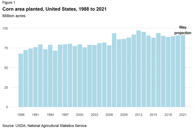 Майский отчет о мировом сельскохозяйственном предложении и спросе (WASDE) дал первый прогноз на 2021/22 маркетинговый год, который начнется 1 сентября 2021 года, в Соединенных Штатах. Ожидается, что высокие рыночные цены будут стимулировать производство кукурузы. По прогнозам, в 2021/22 году производство кукурузы вырастет на 6 процентов, составив 14 990 миллионов бушелей. Национальная служба сельскохозяйственной статистики (NASS) сообщила в своем отчете от 31 марта, что производители намерены засеять 91 миллион акров кукурузы в 2021 году. Рыночные цены на кукурузу (а также на соевые бобы и другие альтернативные культуры) выросли с момента проведения опроса в марте. Отчет NASS о посевных площадях от 30 июня, в котором будут представлены первые данные о посевных площадях и прогноз уборочных площадей на основе опросов, станет следующей важной порцией данных от Министерства сельского хозяйства США по площади. Текущий показатель посевных площадей немного повышен по сравнению с посевными площадями 2020/21 года.