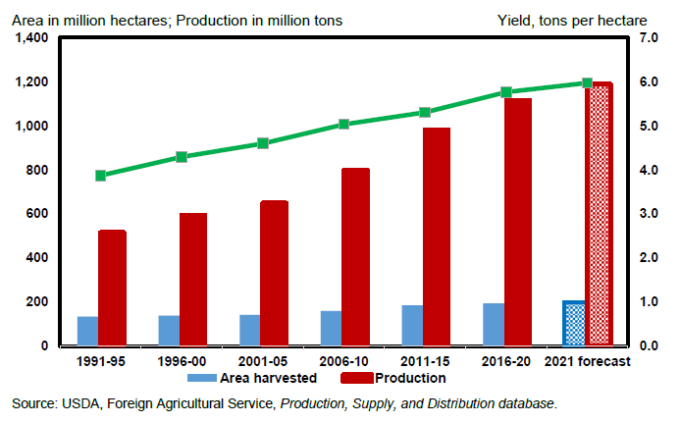 Рисунок 10. Мировые площади, производство и урожайность кукурузы: средние за 5 лет и прогноз на 2021 год