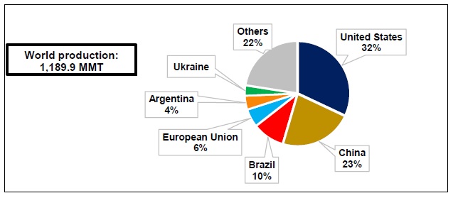 В мировом производстве кукурузы доминируют 6 стран (регионов), которые производят почти 80 процентов мировой кукурузы. Соединенные Штаты являются крупнейшим производителем, хотя их доля в мировом производстве (которая раньше превышала 40 процентов) с 2010 года составляет менее 35 процентов. За тот же период совокупная доля производства кукурузы в Бразилии и Аргентине увеличилась с 10 до 14 процентов.