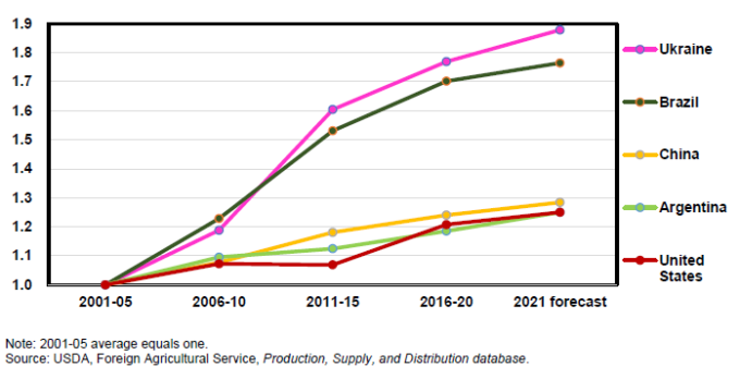 Со временем урожайность кукурузы изменяется неравномерно среди крупнейших производителей, причем наиболее быстро она растет в Украине и Бразилии, хотя и с более низкой базы. Однако даже при сильном тренде урожайности — в абсолютном выражении урожайность кукурузы в этих двух странах ниже, чем в Аргентине, и значительно ниже уровня США. Среди этих основных производителей прогнозируемый уровень урожайности кукурузы по-прежнему самый низкий в Бразилии, за ней следует Украина.