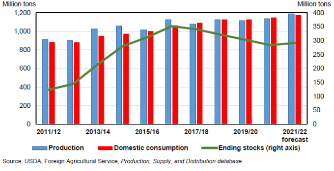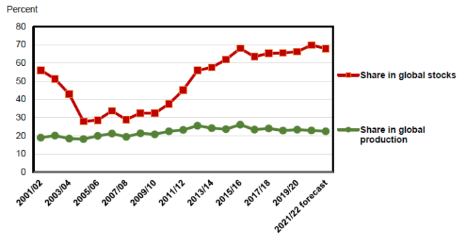 Хотя доля Китая в мировых остатках кукурузы, согласно прогнозу, несколько снизится в 2021/22 году, его доля в мировых остатках намного выше (более чем в три раза), чем его доля в мировом производстве кукурузы, и находится на этом уровне с 2015/16 года.