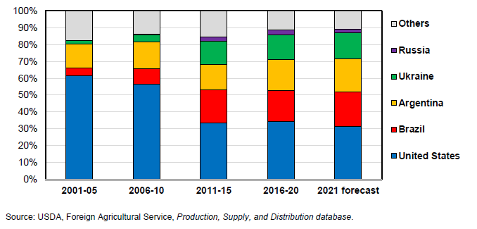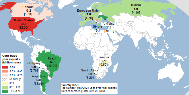 Ожидается, что увеличение запасов кукурузы, прогнозируемое для стран-экспортеров в 2021/22 году, создаст сильную конкуренцию с перераспределением мирового производства и экспорта кукурузы в пользу Бразилии, Аргентины и Украины. Ожидается, что в 2021/22 году совокупное производство кукурузы этими тремя основными экспортерами будет на 21,0 тонну выше, чем в предыдущем году. Эти в значительной степени ориентированные на экспорт страны экспортируют в совокупности 108,5 млн. тонн кукурузы, что на 75 процентов больше прогнозируемого экспорта США, причем экспорт США будет снижаться.