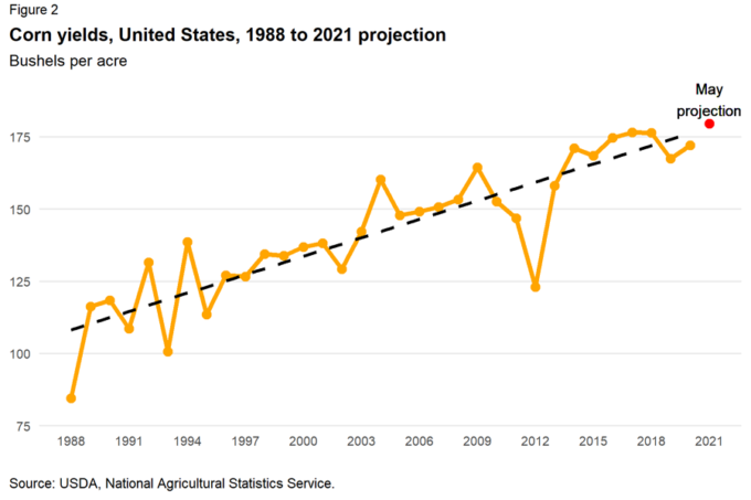 Урожайность кукурузы в США прогнозируется на уровне 179,5 бушелей с акра, исходя из трендовой урожайности с поправкой на погодные условия, начиная с 1988/89 года. Текущий прогноз предполагает нормальный уровень осадков и умеренные условия в июле, отсутствие экстремальных отклонений от нормальных осадков в июне и нормальный прогресс посевов до середины мая для восьми штатов, учтенных в модели (Иллинойс, Айова, Небраска, Миннесота, Индиана, Огайо, Южная Дакота и Канзас).