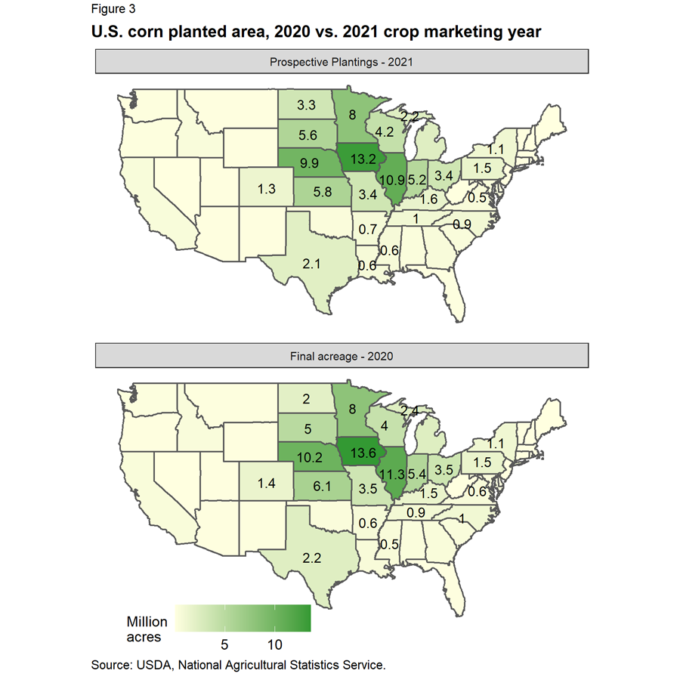 Рисунок 3. Посевная площадь кукурузы в США в 2020 и 2021 гг.