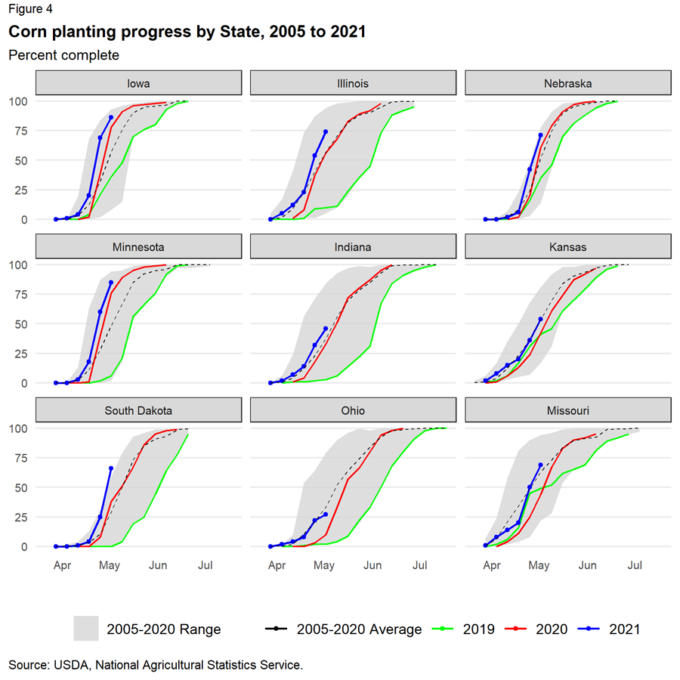 До сих пор температурные условия менялись в течение всего посевного сезона, с небольшими похолоданиями в апреле. Кроме того, проводился тщательный мониторинг засушливых условий, в первую очередь в юго-западном и западном регионах США. Согласно последним картам «Монитор засухи», опубликованным 4 мая, на западных и северных равнинах и на некоторых ограниченных участках кукурузного пояса наблюдаются умеренные и суровые засушливые условия. По состоянию на 9 мая посев проходил быстрее среднего в большинстве крупных штатов, производящих кукурузу, особенно к западу от реки Миссисипи и в северных регионах кукурузного пояса. Ранние признаки говорят о том, что посевной сезон пока проходит гладко.