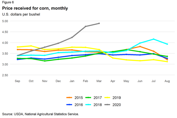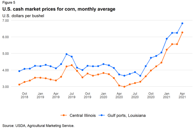 Цены на наличном и фьючерсном рынках кукурузы начали значительно расти в конце лета 2020 года и оставались на высоком уровне до начала 2021 года. В апреле наличные цены снова подскочили, в первую очередь из-за сокращения прогноза производства в Южной Америке и сохранения высокого мирового спроса. Средняя наличная цена на кукурузу в Центральном Иллинойсе в апреле превысила 6 долларов за бушель впервые с июля 2013 года. Фермерские цены также росли, хотя и отставали от роста, наблюдаемого на наличном и фьючерсном рынке. Это увеличение связано с тем, что производители продают зерно по ценам, установленным в начале года до того, как рост цен полностью проявился. Кроме того, поскольку производители продали и доставили большую часть урожая 2020/21 года, последующие месяцы будут иметь меньшее влияние на среднесезонную цену 2020/21 года. Аналогичным образом ожидается, что в 2021/22 году среднесезонная фермерская цена будет зависеть от производителей, которые законтрактовали поставку нового урожая для поставки осенью и зимой по ценам, основанным на текущих рыночных уровнях. До публикации майского WASDE форвардные цены на поставку осенью были близки или превышали 6,00 долларов за бушель во многих регионах кукурузного пояса.