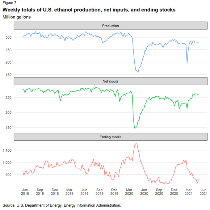 Рисунок 7. Производство, потребление и конечные остатки этанола в США, еженедельные объемы.