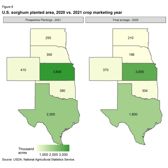 Согласно прогнозу, производство сорго в США в 2021/22 году составит 427 миллионов бушелей по сравнению с 373 миллионами бушелей в предыдущем году. NASS сообщило, что производители планируют засеять 6,9 миллиона акров сорго, что на 18 процентов больше, чем в 2020/21 году. Сообщалось о намерениях по увеличению посевов во всех основных штатах-производителях сорго, включая два крупнейших штата-производителя — Канзас и Техас. Прогнозы урожайности сорго на 2021/22 год основаны на 20-летнем среднем показателе в 68,9 бушелей с акра, что ниже уровня прошлого года, составлявшего 73,2 бушеля с акра.