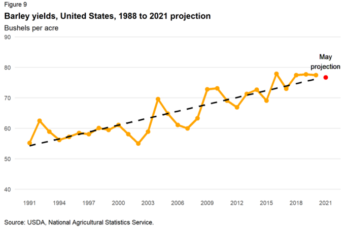 Рисунок 9. Урожайность ячменя в США с 1988 по 2021 гг.