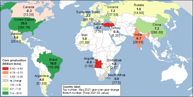Экспорт бразильского урожая 2020/21 года начнет сезонно нарастать в период с июля по август 2021 года и продолжится до марта 2022 года, и, как ожидается, повлияет на экспортные рынки в следующем 2021/22 году. Поскольку экспорт бразильской кукурузы в 2020/21 международном торговом году снижается, экспорт кукурузы из США в текущем торговом году повышен на 3,0 миллиона тонн до 70 миллионов.