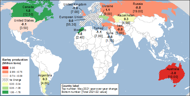 Карта 2. Изменения в производстве ячменя (млн. тонн) для 2021/22 года