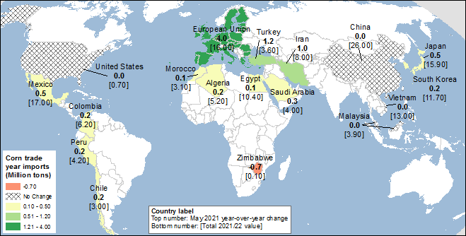 Китай импортирует большие объемы кукурузы, не делая никаких официальных заявлений по поводу увеличения нынешней тарифной квоты в размере 7,2 млн. тонн с непомерно высоким тарифом. Хотя импорт заменителей кукурузы (таких как ячмень и сорго) в последние годы был значительным, поскольку на них не распространялись тарифные квоты, критическим изменением в 2020/21 году, которое, как ожидается, сохранится в 2021/22 году, было решение импортировать кукурузу в количествах, значительно превышающих уровни квот. Хотя Китай является вторым по величине производителем кукурузы в мире с большим отрывом, ожидается, что страна также станет крупнейшим импортером кукурузы.