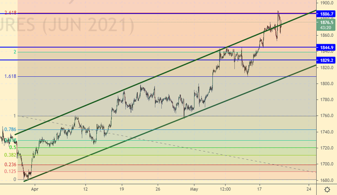 Видим, что ход по золоту достиг своих теоретических целей. Теперь должна последовать коррекция в район 1850, возможно 1820, после чего быки сделают попытку создать следующий импульс уже к отметке 2000.