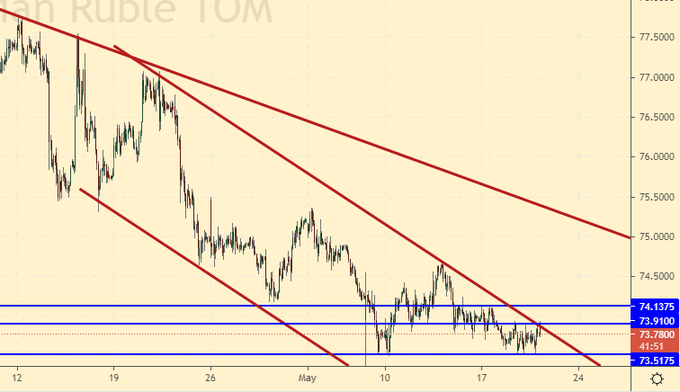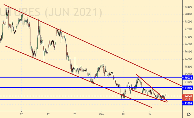 Продажа: после падения ниже 73700. Стоп: 74100. Цель: 71200.