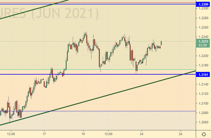 Скорее всего поход к 1.2300 (1.2800) будет сегодня продолжен. Судя по снижению агрессии со стороны демократов на международной арене сейчас им не до конфронтаций. Вот и из Афганистана солдаты дяди Сэма собираются окончательно уйти. И не слышно, чтобы были новые скандалы с Китаем, после поездки делегации КНР на Аляску.