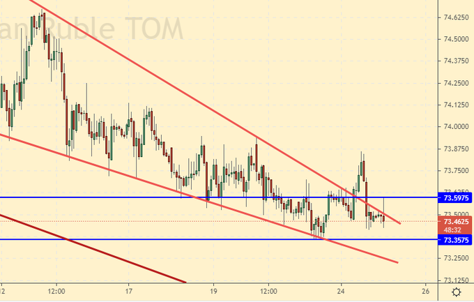 Прошла информация, что возможно встреча Путин – Байден. Встреча с господами в пробковых шлемах для нас не последнее дело, поэтому определенный оптимизм сегодня на рынке будет. Если пара сможет закрепиться ниже 73.50, на рынок могут войти патриоты, которые продавят пару как минимум на рубль. Далее, если доллар не подведет, и продолжит слабеть, мы можем оказаться на 71.20.