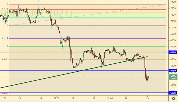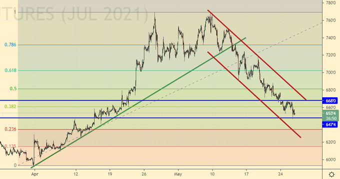 Пшеница хочет несколько перевыполнить наш план по падению. Пусть так. Мы с удовольствием купим не только от 650.0, но в перспективе и от 630.0. Покупая, будем рассчитывать на то, что прогноз по валовому сбору от USDA в мае был слишком оптимистичным. В июне настроения могут стать более сдержанными, а значит и цены на пшеницу вновь развернуться вверх.