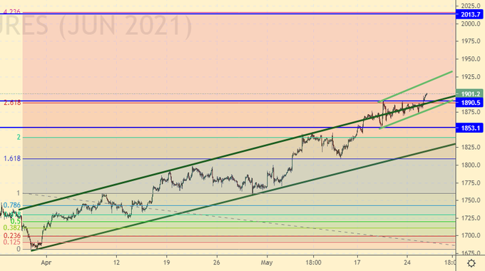Рынок не стал откатывать и продолжил рост, преодолев символический уровень 1900. Здесь надо покупать. Очень мало сомнений в том, что теперь мы не сможем достичь 2000 долларов за унцию. Вероятно, что рынок будет расти вплоть до заседания ФРС 16-го июня.