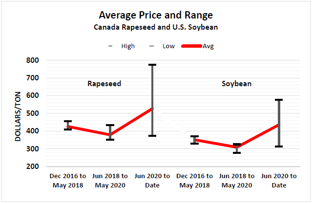 Рисунок 2. Средняя цена и ее диапазон. Канадский рапс и американская соя