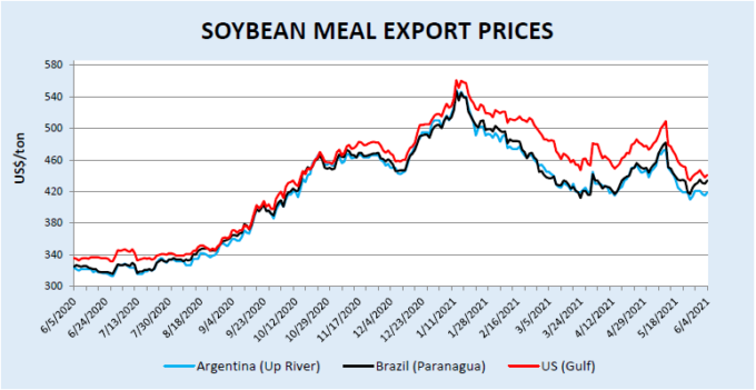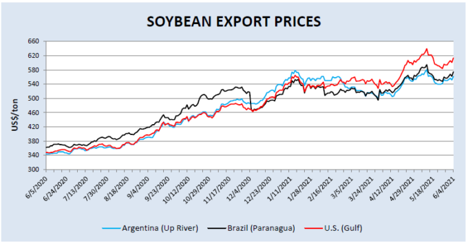Экспортные цены на соевые бобы в США, Бразилии и Аргентине выросли в мае, в основном из-за устойчивого спроса со стороны Китая и опасений по поводу второго урожая кукурузы в Бразилии, способствовавшим росту цен на кукурузу. Соевые бобы в США, Бразилии и Аргентине достигли рекордных максимумов почти за десятилетие. Рекордный объем экспорта Бразилии в мае и ожидания сохранения высокого спроса со стороны восстанавливающегося свиноводческого сектора Китая будут поддерживать высокие цены на сою.