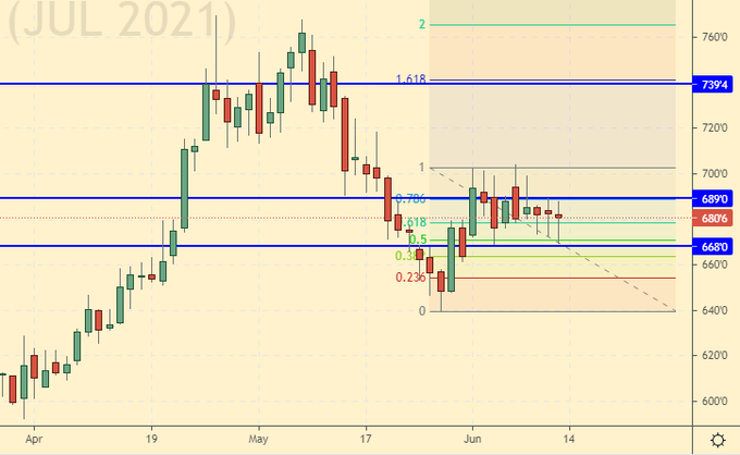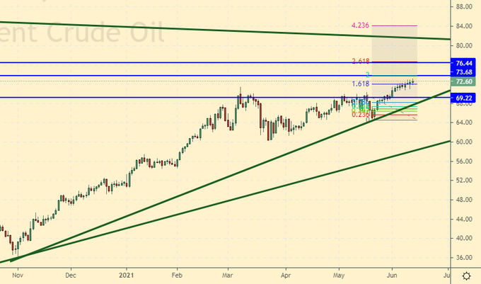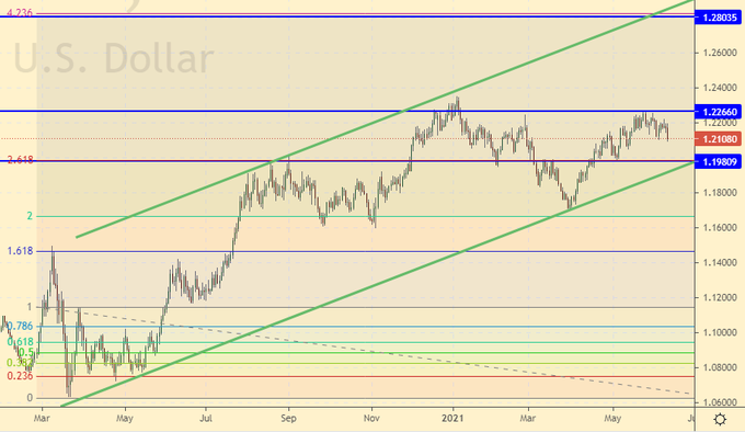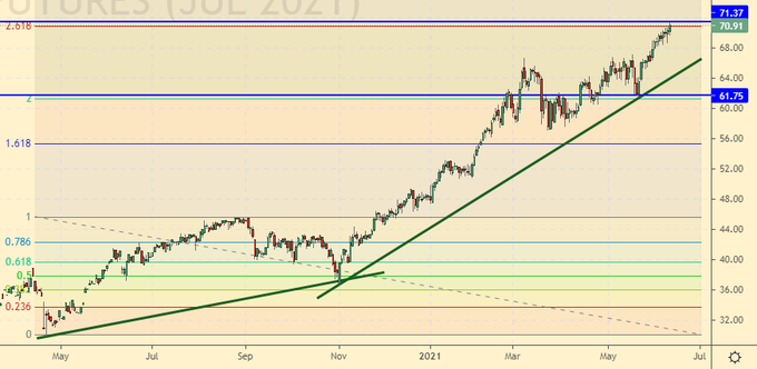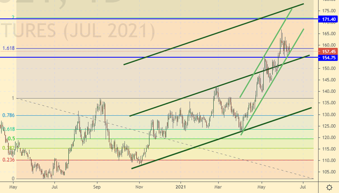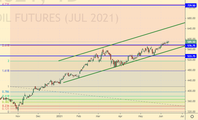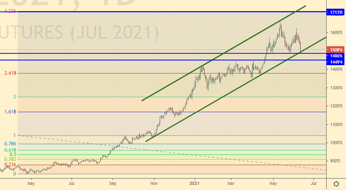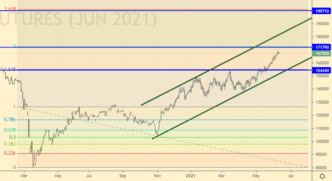 16-го июня нас ждет заседание ФРС. Вряд ли Пауэлл поднимет ставку, но он может заявить о конце политики выкупа активов, что станет первым шагом на пути к возможному ужесточению ставки в будущем. Рост потребительской инфляции в США до 5% годовых это повод для того, чтобы обратить на неё внимание. Темпы роста цен оказались самыми мощными за последние 40 лет, и если председатель ФРС никак не прокомментирует это событие, то у рынка commodities появится новый шанс на покорение вершин.