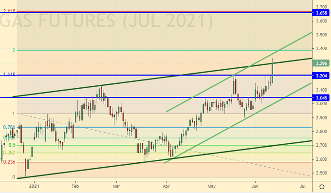 Сценарий роста: рассматриваем июльский фьючерс, дата экспирации 28 июня. Показали новый локальный максимум. Продолжаем держать лонги. Газ уходит в Азию. Европа на голодном пайке. Есть неплохие шансы на продолжение роста.
