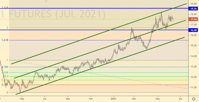 Сценарий роста: рассматриваем июльский фьючерс, дата экспирации 30 июня. Рынок выше 18.50 не виден. Не покупаем. Нужен откат хотя бы к 15.50.
