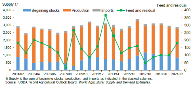 o Прогнозируется, что на уровне 180 миллионов бушелей кормовое и остаточное потребление станет самым высоким с 2013/14 маркетингового года.