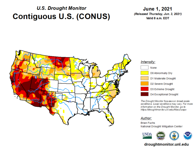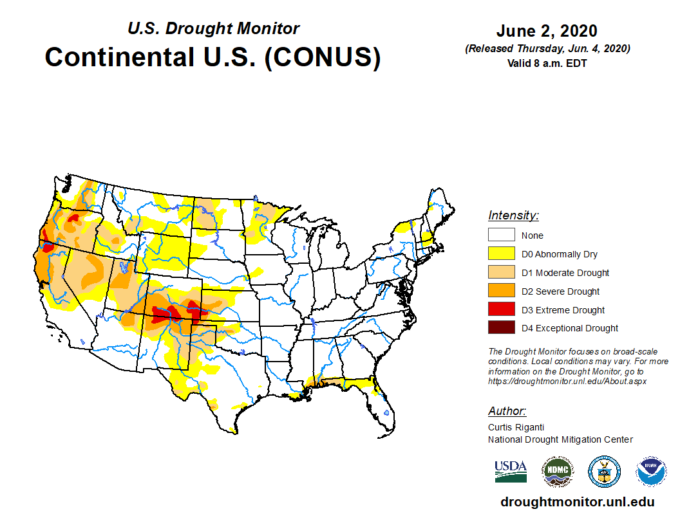 o Производство белозерной озимой пшеницы, которое сконцентрировано в пострадавшем от засухи Северо-Западном Тихоокеанском регионе (рисунок 2), снижено на 8 процентов по сравнению с майским прогнозом до немногим более 202 миллионов бушелей.