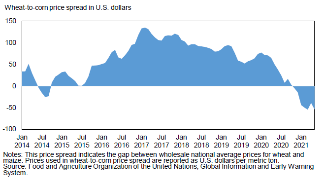 Прогнозируемое кормовое и остаточное потребление в Китае не изменилось и составляет 35 миллионов в 2021/22 году и 40 миллионов в 2020/21 году. Эти оценки представляют собой два самых больших годовых показателя для кормового и остаточного потребления пшеницы в Китае, поскольку пшеница остается очень конкурентоспособной по цене. Скидка на пшеницу по сравнению с кукурузой в Китае (измеренная по средней цене по стране) увеличилась в течение мая (рисунок 3), поскольку цены на пшеницу выросли лишь незначительно, а цены на кукурузу резко подскочили.