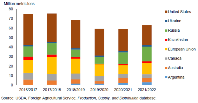 Увеличение производства озимой пшеницы в 2021/22 году повышает запасы пшеницы, а также кормовое и остаточное потребление в США