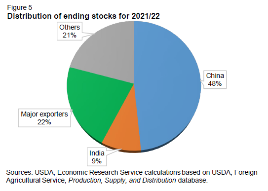 За исключением основных стран-экспортеров, наибольшая корректировка была сделана для Индии, остатки которой снизились на 400 000 метрических тонн до 27,6 миллионов метрических тонн в связи с увеличением экспорта и сокращением начальных запасов. Согласно прогнозу, остатки Индии по-прежнему будут рекордными, и на ее долю будет приходиться 9 процентов мировой торговли (рисунок 5). Прогнозируется, что в Китае будет храниться 142,6 млн метрических тонн, что на 200 000 больше, чем ожидалось в прошлом месяце, на основе пересмотра начальных запасов. Остатки Китая составляют 48 процентов от мирового объема. Остатки в Молдове снижены на 115 000 тонн до 186 000 в результате сокращения начальных запасов, которое превосходит повышение производства. Начальные запасы в Молдове снижены в результате пересмотра в сторону увеличения кормового и остаточного потребления в 2020/21 году. Начальные и конечные остатки Марокко для 2021/22 года скорректированы в сторону понижения в связи с сокращением импорта в 2020/21 году.
