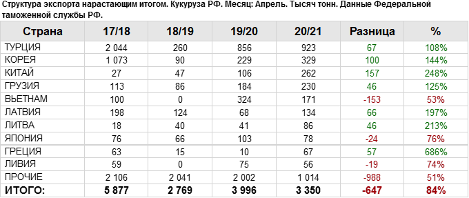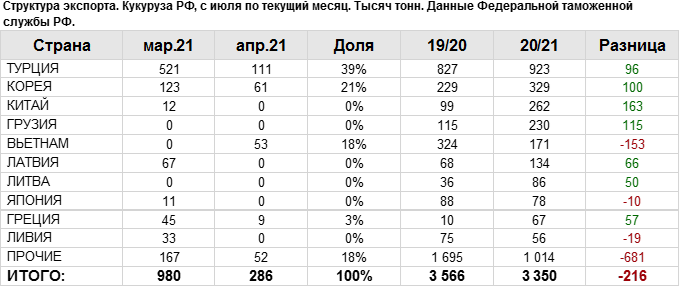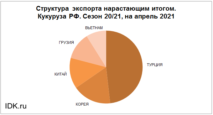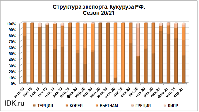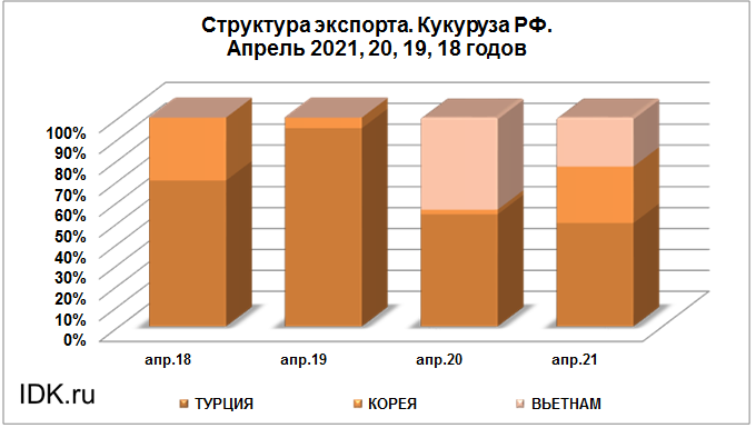 Объем поставок кукурузы на экспорт за период с июля 2020 года по апрель 2021 года в Корею составил 328.51 тыс. тонн, что на 99.76 тыс. тонн больше объема поставок в данную страну в прошлом сезоне на тот же отчетный месяц.