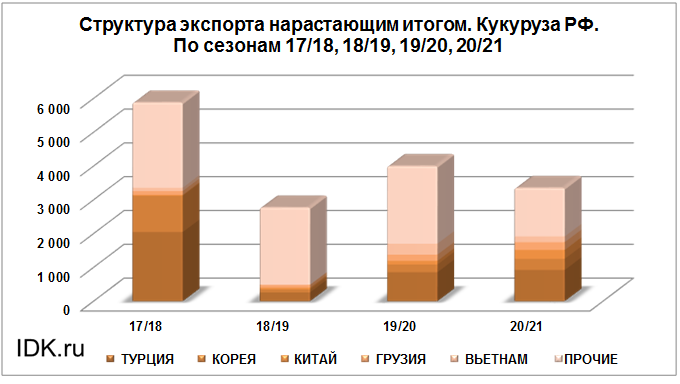Структура экспорта кукурузы из России нарастающим итогом по сезонам