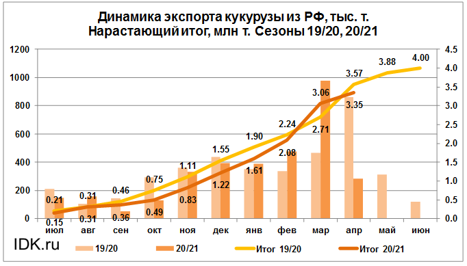 Объем поставок кукурузы на экспорт за период с июля 2020 года по апрель 2021 года в Китай составил 262.25 тыс. тонн, что на 162.85 тыс. тонн больше объема поставок в данную страну в прошлом сезоне на тот же отчетный месяц.