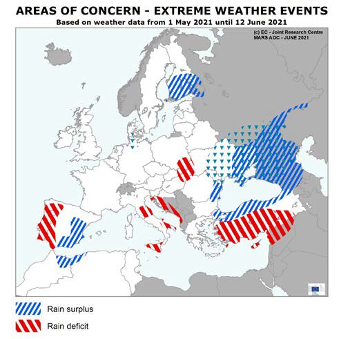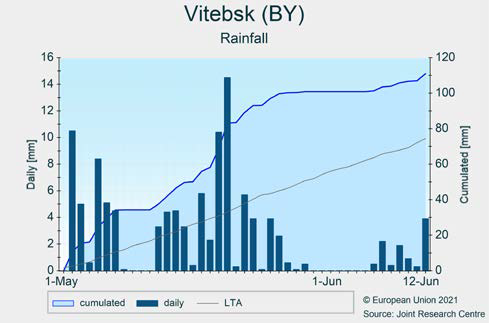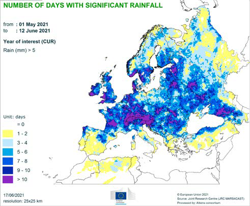 Чрезмерно влажные условия в Балтийском регионе, а также на юге и востоке Украины привели к усилению давления со стороны вредителей и болезней и затруднили полевые работы. Кроме того, в Украине и на севере Германии / юге Дании снижение радиации в период стадии цветения озимых зерновых культур снизило потенциал урожайности.